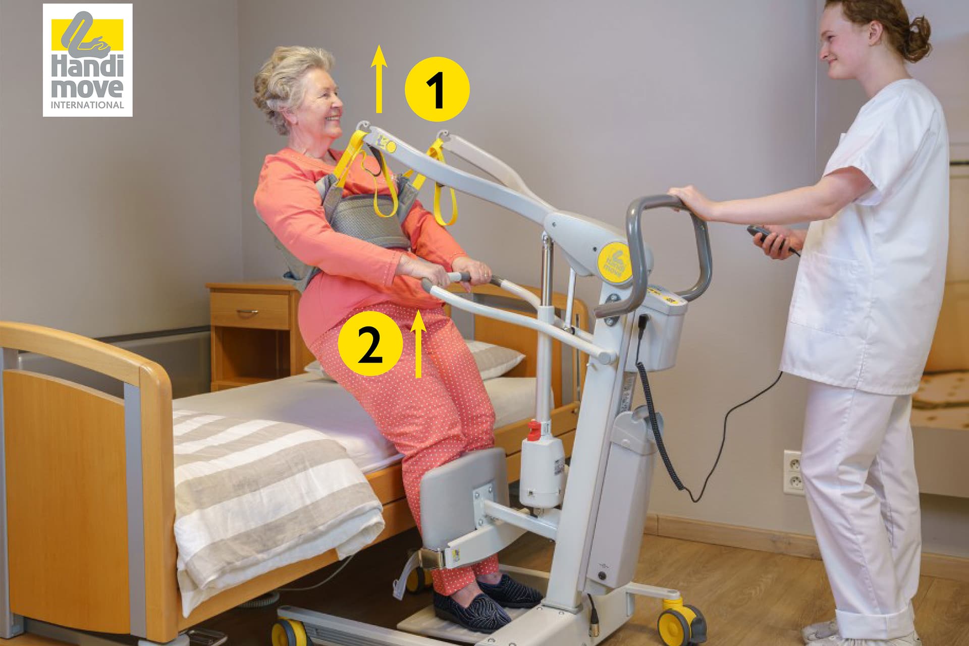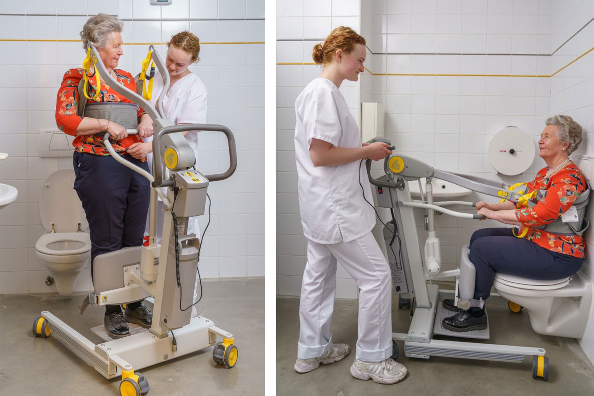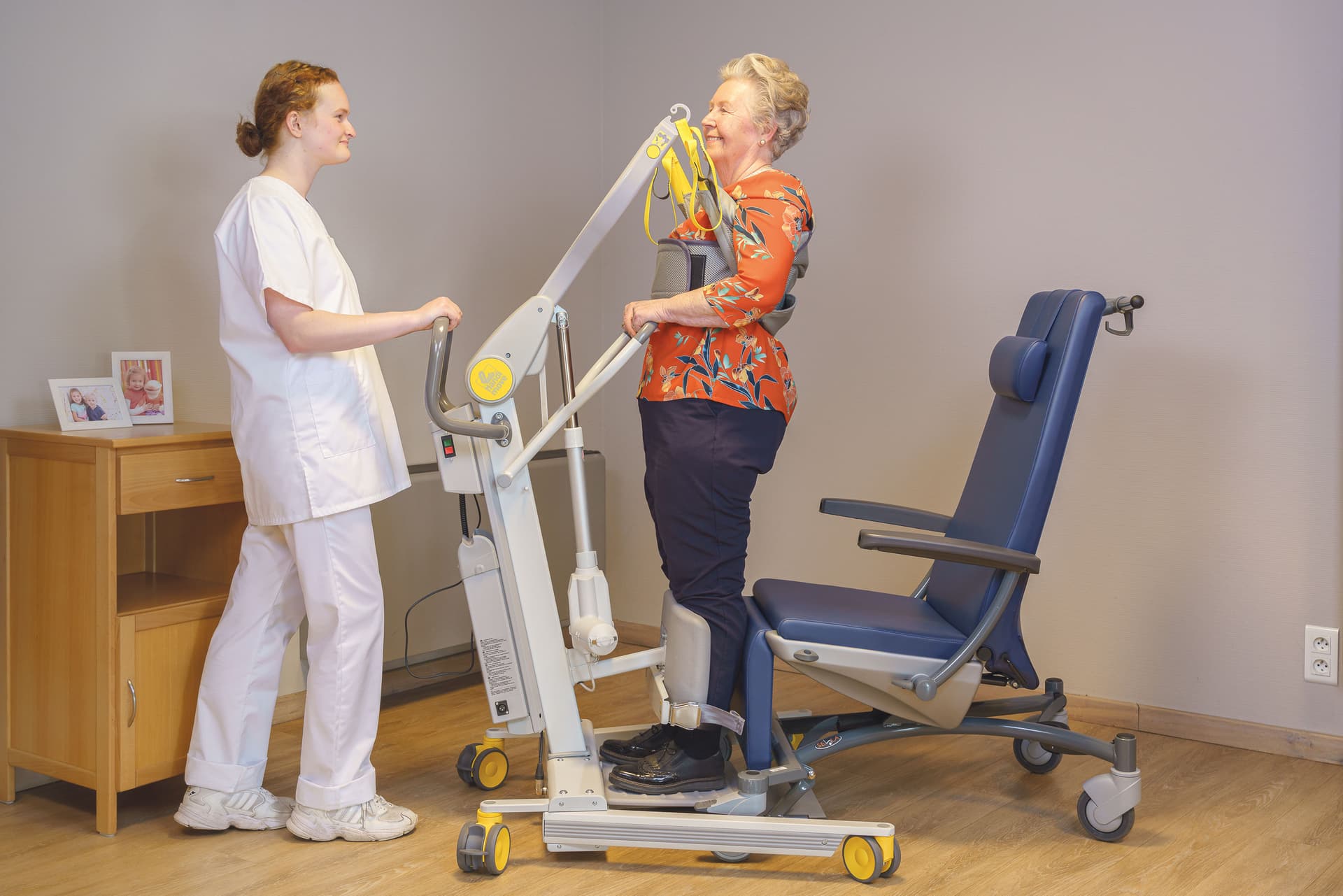 Aufstehhilfe für Benutzer, die mit Hilfe noch stehen können und Unterstützung beim Aufrichten brauchen. Wenig oder keine Belastung unter den Achseln. Sicher und bequem vom Sitzen bis zum Stehen.
