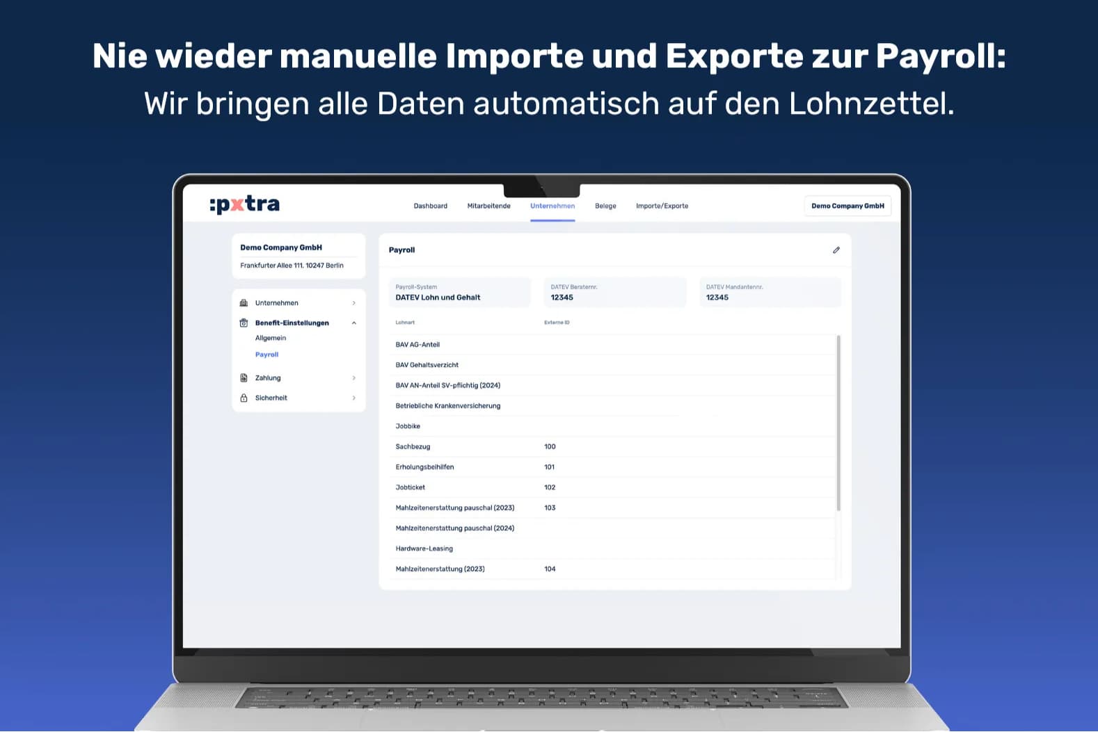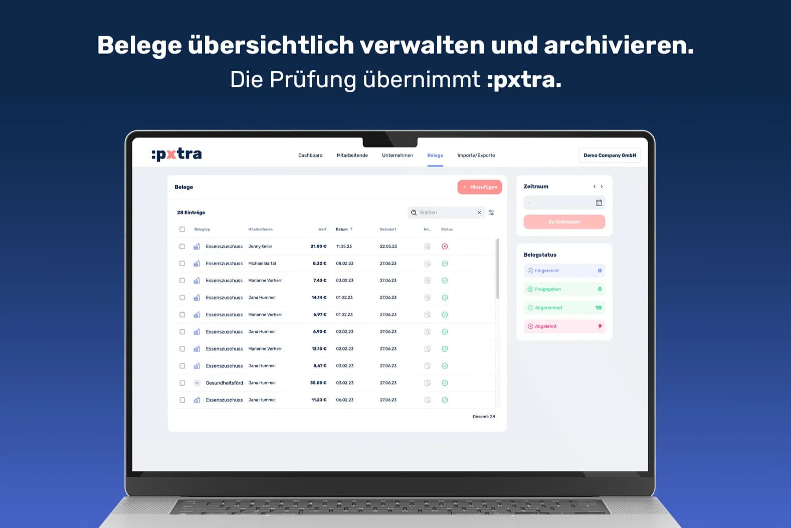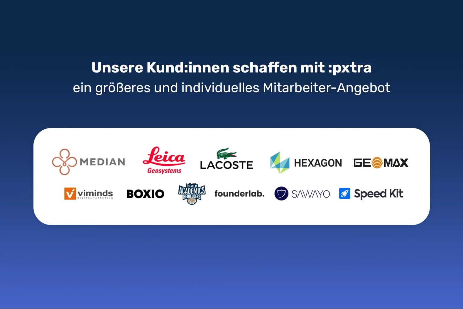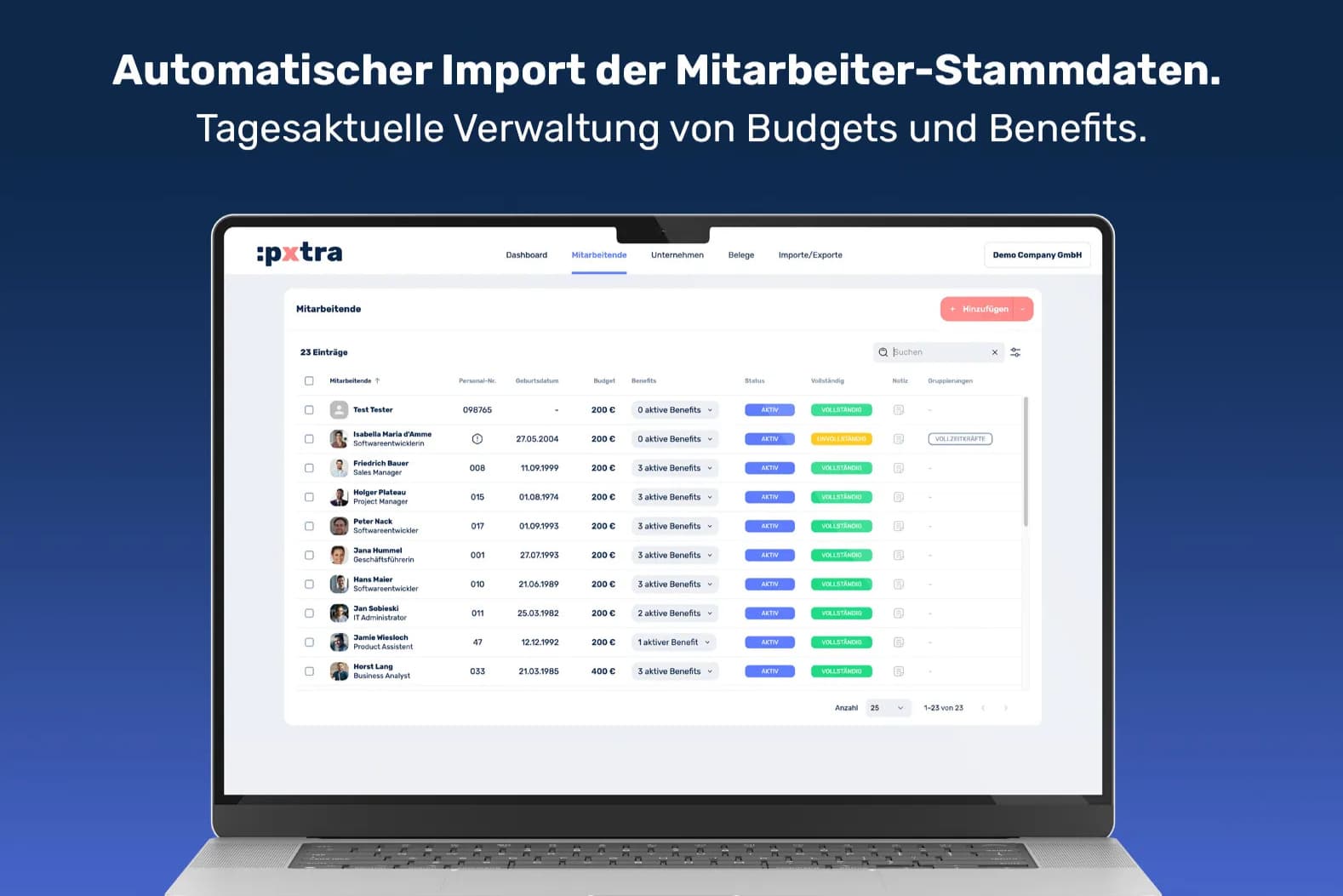 pxtra ist die digitale Lösung für individuelle Mitarbeiter-Benefits und dein persönlicher Schüssel zu moderner Wertschätzung: du vergibst ein monatliches Budget und deine Mitarbeitenden entscheiden selbst, für welche Benefits sie es einsetzen - einfach und rechtssicher.Per App greifen deine Mitarbeitenden von überall aus auf ihre Vorteile zu, während du mit unserer HR-Plattform zentral Budgets, Boni und Angestellte verwalten kannst.Mit nur wenigen Klicks exportierst du alle wichtigen Daten gesammelt für deine Lohnabrechnung und reduzierst damit deinen Aufwand um bis zu 80% gegenüber herkömmlichen Einzellösungen.